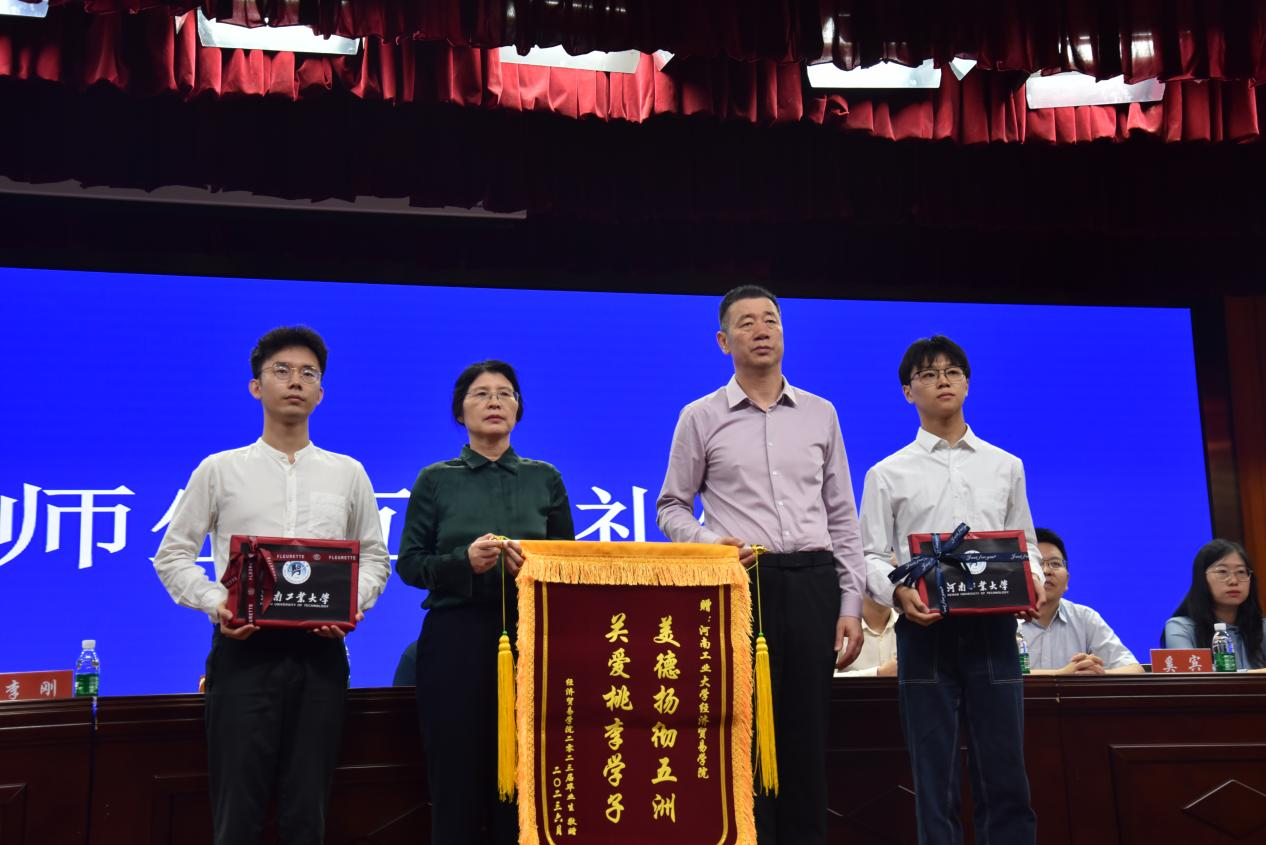接受毕业生赠送的锦旗,并向毕业生赠送纪念礼物。随后,全体毕业生起立,在老师的见证下,由毕业生王文龙领誓,共同进行庄严的廉洁从业宣誓。