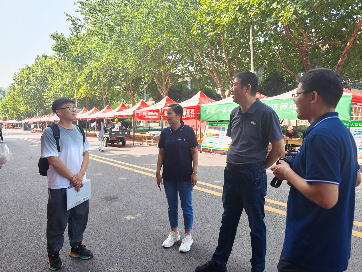 迎新现场,慰问新生、工作人员及志愿者们。李刚、岳鹏珍在迎新现场与新生亲切交谈,对其到来表示欢迎,并送上诚挚祝福与殷切期望。