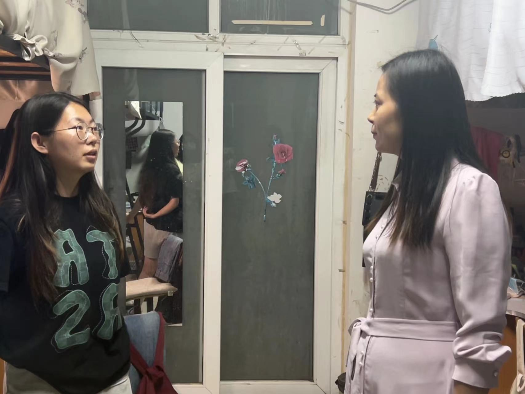 岳鹏珍与全体辅导员走访寝室期间,对寝室内环境进行检查,与同学们面对面交流,关心同学们的学习生活情况,耐心询问了每一位同学的学习情况、未来的发展方向和目标,并进行了相应指导。耐心听取记录同学们的诉求和意见。同时关心学生宿舍的水管爆破情况对生活造成的影响,并提醒同学们务必高度重视消防安全,注意宿舍用电安全,预防寝室火灾,做到防患于未然。
