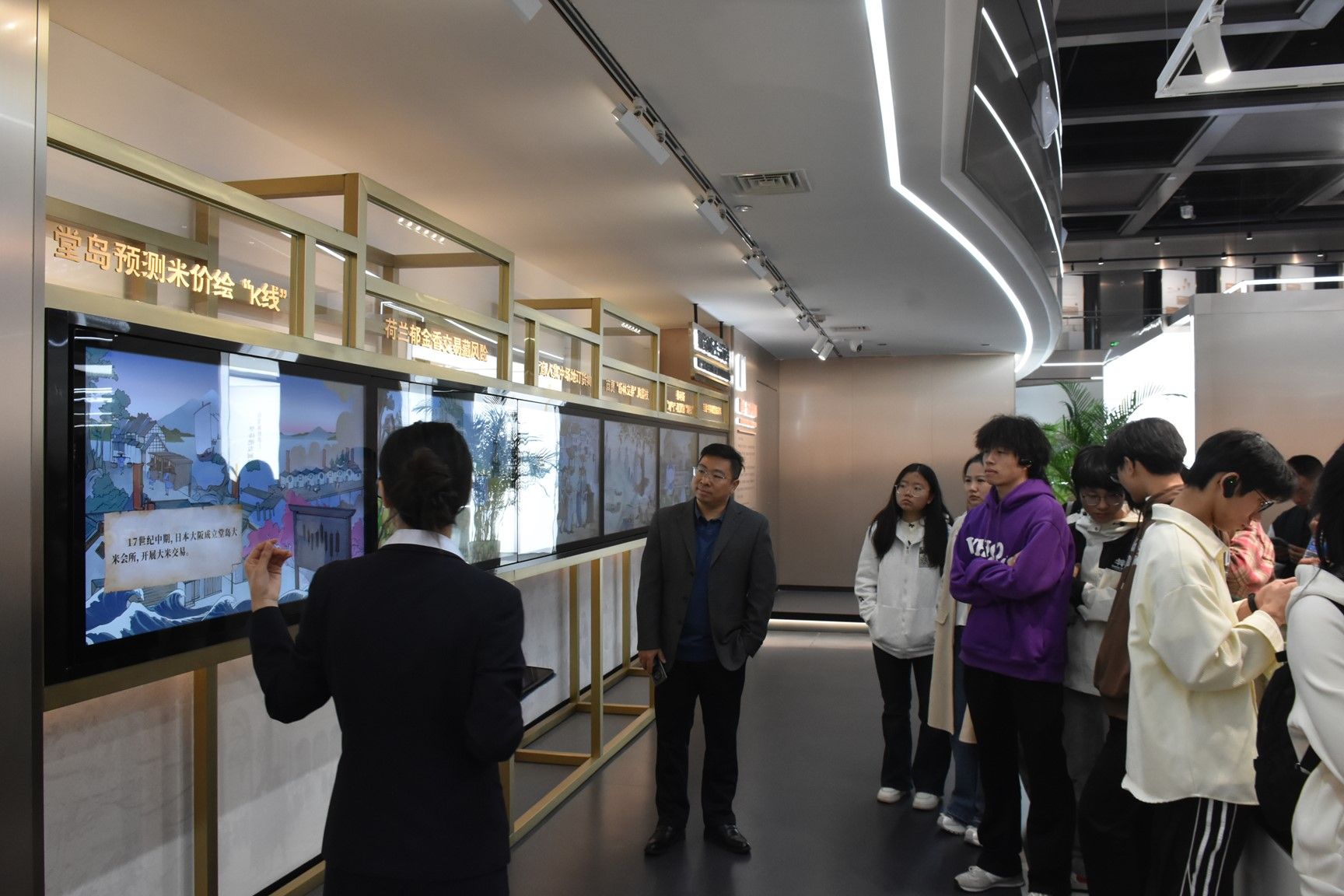 5位老师的带领下,100多名学生怀着浓厚的兴趣和期待来到实习场馆。博览馆以其丰富的专业内容和先进的展示手段,为学生们提供了全面了解期货与衍生品市场的窗口。学生们被一幅幅反映国内外期货市场起源和发展的历史画卷所吸引:纸质交易仓单、红马甲、黄马甲、“厦门现象”如何助力大宗商品供应链行业发展等。通过参观这些展览,学生们对期货市场的历史脉络和现代化进展有了更加清晰的认识,深刻感受到了期货市场在经济发展中的重要作用,获得了在课堂上无法接触到的知识。