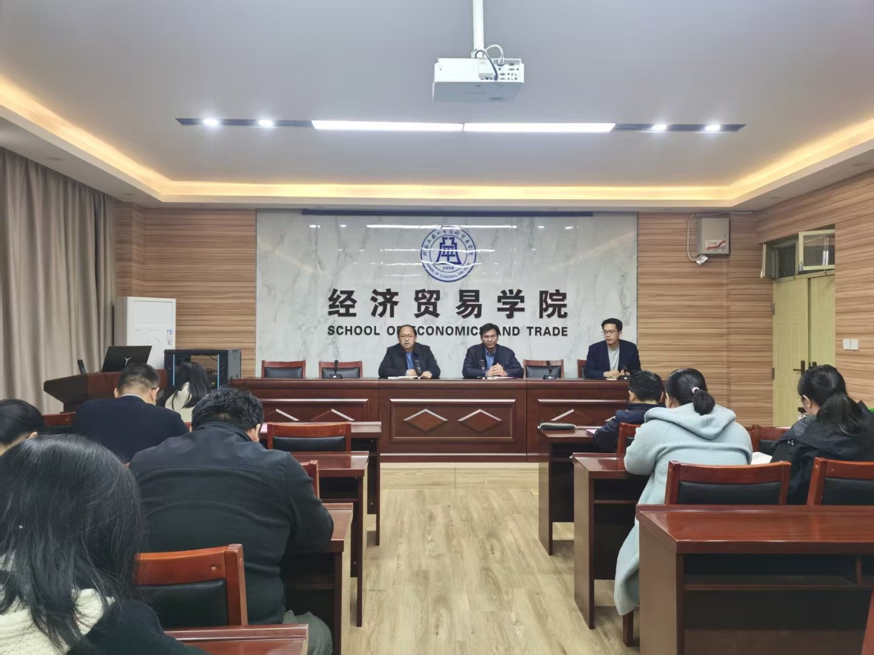 会上,研究生工作办公室主任刘清娟领学新时代高校教师职业行为十项准则,要求研究生导师在处理好师生关系的同时恪守学术道德。随后,金融专硕学位点负责人宋博、农业专硕学位点负责人何宇鹏、国际贸易专硕导师牛晓迪,结合教指委相关文件与国内重点高校培养经验,就专硕分类培养依次做了专项报告。最后,副院长朱坤林结合博士点申报材料,鼓励硕士生导师指导硕士生积极发表高水平论文,青年教师要在粮食领域高水平论文上加快突破。