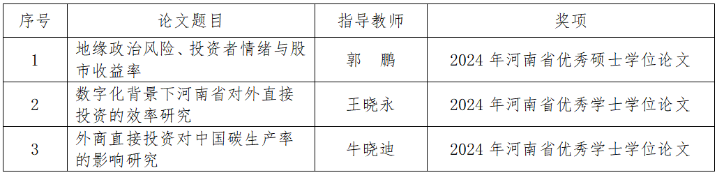 郭鹏老师指导的硕士学位论文《地缘政治风险、投资者情绪与股市收益率》荣获“河南省优秀硕士学位论文”;王晓永老师指导的学士学位论文《数字化背景下河南省对外直接投资的效率研究》和牛晓迪老师指导的学士学位论文《外商直接投资对中国碳生产率的影响研究》荣获“河南省优秀学士学位论文”。星空体育