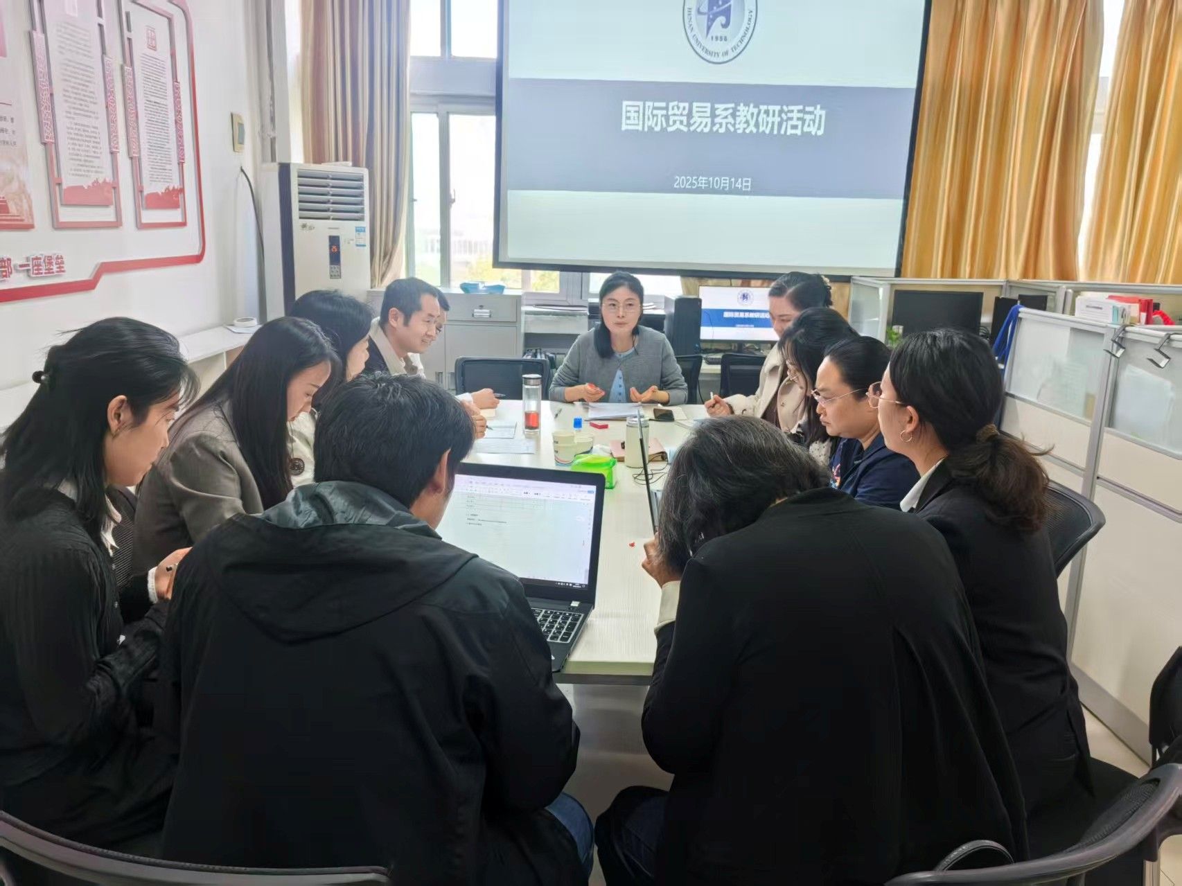 为深入推进教育教学改革,提升人才培养质量,2025年10月14日,国际经济与贸易系全体教师在文科组团楼3505教室举行了一场富有成效的教研活动。本次活动由系主任樊慧玲主持,内容涵盖工作总结、成果表彰与教学大纲修订研讨,气氛热烈,成效显著。