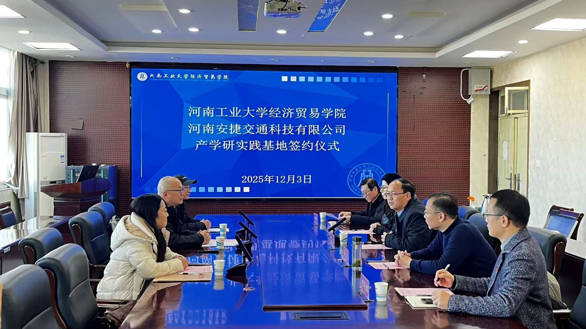 院长李文启、副院长郭力、经济系主任何宇鹏、教师代表任新平、王海虹,河南安捷交通科技有限公司总经理李峰、技术总监周育乐、行财部经理陈辉参加了会议,会议由李文启主持。