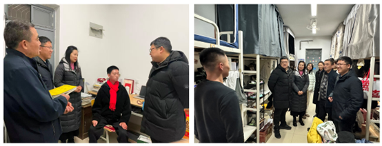 会议后,在党委书记高泉、党委副书记岳鹏珍、院关工委常务副主任杨茂的带领下,全体辅导员深入学生宿舍进行走访。详细查看了宿舍卫生、用电安全等情况,与同学们亲切交谈,细致了解学生的期末备考状态、离校行程安排以及假期计划,反复叮嘱同学们要增强安全意识,遵守校规校纪,注意防火防盗防骗,合理安排学习与生活,平安顺利度过期末阶段,并祝愿同学们假期愉快、新年进步。
