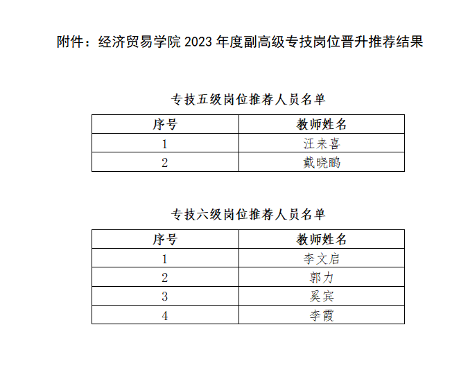 根据校人事处2023年度副高级专技岗位晋升工作安排,经个人申报、校人事处审核、星空体育 评审,现将星空体育 2023年度副高级专技岗位晋升推荐结果予以公示,公示时间截止2023年6月1日18:00。如有异议,请以书面形式向星空体育 反映。联系电话:0371-67756696。