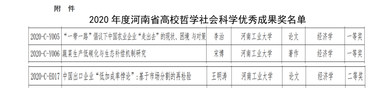 近日省教育厅发布《河南省教育厅关于公布2020年度河南省高校哲学社会科学研究成果奖的通知》(教社语〔2021〕331号),星空体育 李治老师和王明涛老师分别获得经济学科论文一等奖和二等奖,宋博老师获得经济学科著作一等奖。据悉此次研究成果奖经过星空体育 推荐、专家评审和公示,共评选2020年度河南省高校哲学社会科学研究成果奖496项,其中特等奖71项,一等奖108项,二等奖143项,三等奖174项。(星空体育 )