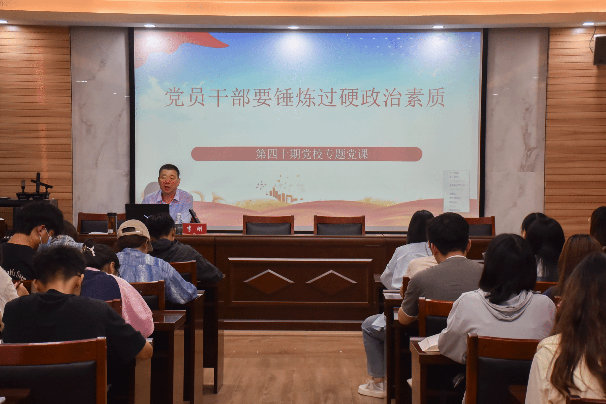 于3605会议室举办入党积极分子培训班第五次专题党课。院党委书记李刚以“党员干部要锤炼过硬政治素质”为主题进行培训讲授,第四十期全体入党积极分子参加了此次培训。会议由院团委副书记王秋瑾主持。