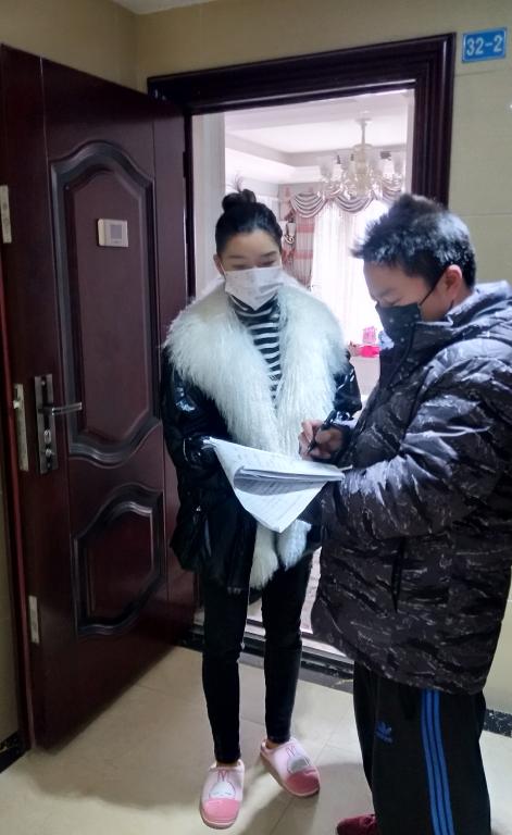 “同志您好!请配合测量一下体温,谢谢!”“咚咚咚......叔叔阿姨您好!我是新桥社区的工作人员,为了您及家人还有邻居的健康安全,现就新型肺炎排查防控进行登记,耽误您几分钟时间,麻烦登记一下信息!”。