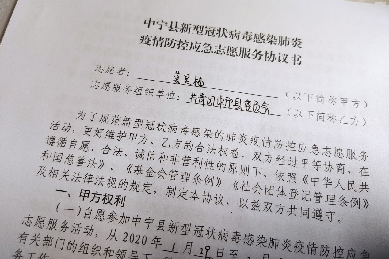 当我看到了河南共青团招募志愿者的时候,也心想着什么时候能为家乡的疫情防控做些什么。终于,就在我思考怎么才能贡献出一份自己的力量的时候,1月29日上午,团县委的公众号发布了招募志愿者的消息,迫不及待的我当天下午就去参加了县医院紧急组织的培训,因为时间有限,培训在室外进行,虽然天气寒冷,但这丝毫没有阻挡我们志愿服务的热心,果断地签订了与团县委的服务协议。