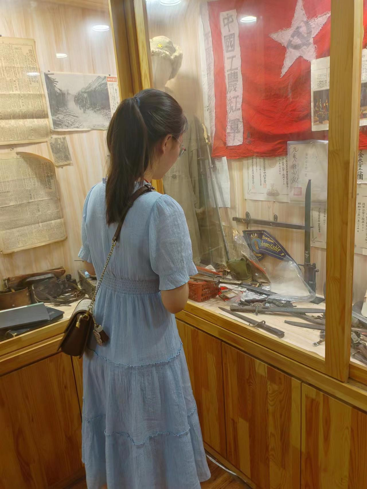 7月15日,团队成员来到柘城县古铁斋抗日战争纪念馆,参观由退伍老兵个人自行收集藏品的柘城县古铁斋抗日战争纪念馆,团队成员站在展馆前,隔着一层玻璃与中国红军烈士们曾经使用过的那些似乎仍带着斑斑血迹的刀、旗帜、文书等展品对视时,真切体会到了身处于那个年代,中华民族一致对外的团结精神、深刻理解到“红军不怕远征难,万水千山只等闲”的乐观精神、明白了“半壁疮痍狼鬼厉,汉水长嘶呜咽”的壮烈。