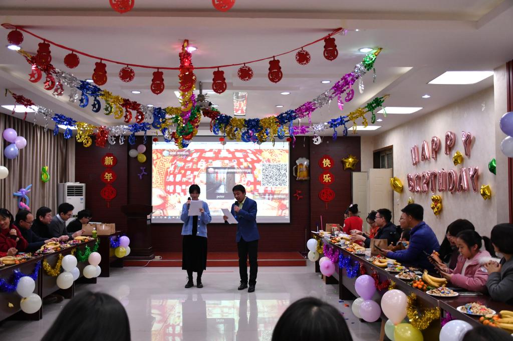 为“逢五逢十”的11名老师举办了集体生日会。生日会上,院党委书记李刚、副院长李文启为过生日的教职工送上了大礼包,寿星们头戴生日帽,一起许愿并吹灭了生日蜡烛。最后进入全体教工大联欢环节,通过一轮又一轮的投屏游戏“数钞票”、“瑞鼠迎春”活跃了全场的气氛。游戏“抢凳子”,“小鸡下蛋”和“抢洗洁精”中,老师们进行了速度与反应力的比拼。“心有灵犀”考验了老师们的默契与配合,奖品伴随游戏一轮一轮地送出,更有一场又一场的“红包雨”将现场气氛推向高潮。
