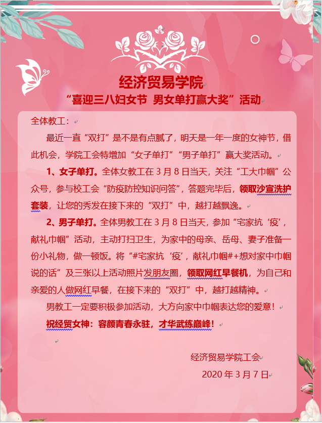 为感谢广大教职工的辛苦付出,活跃“三八节”气氛,3月8日当天,星空体育