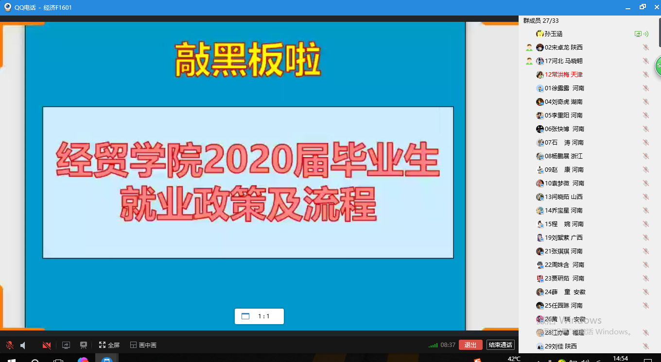 在班级答疑会上,孙玉涵首先就近期疫情期间学生关心的问题进行了集中解答,安抚学生焦虑、不适等情绪,鼓励大家适应线上求职。将学生内心疑虑的就业协议违约、报到证改派等问题,结合毕业生在此过程中可能出现的问题,对应课件内容组织提问。同学们在聆听的过程中针对具体的环节内容,结合自身实际情况逐一进行线上提问。交谈过程中,孙玉涵针对同学们提出的具有共性和个性的问题耐讲解并一一作答,针对具体问题给予同学们专业的指导建议。