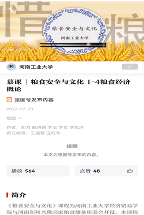 与河南郑州兴隆国家粮食储备库联合制作开设的《粮食安全与文化》慕课近期上线星空体育