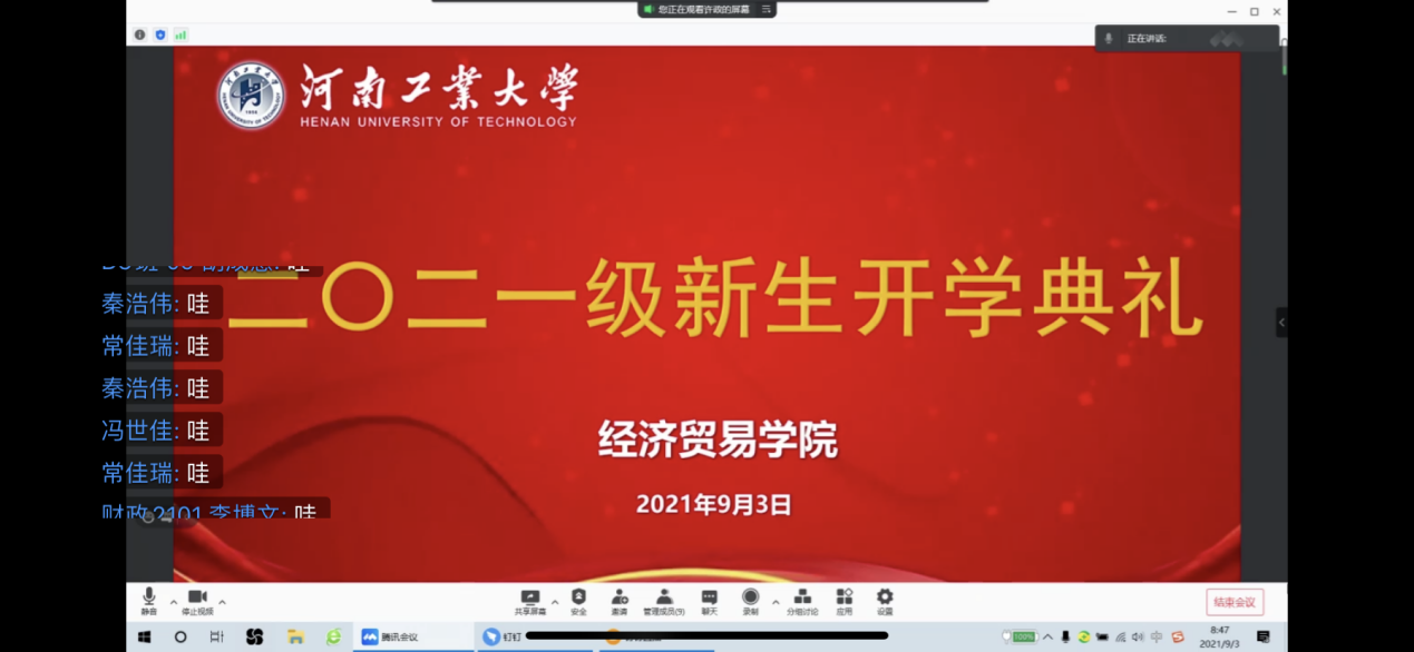 致辞,她首先对2021级新生加入经贸这个大家庭表示欢迎,并表示2021年是不平凡的一年,是“十四五”规划的开局之年,也是中国共产党成立100周年。在河南省遭遇千年特大暴雨、疫情再次席卷而来之际,2021级新生表现出新一代青年的责任担当和初心使命。星空体育