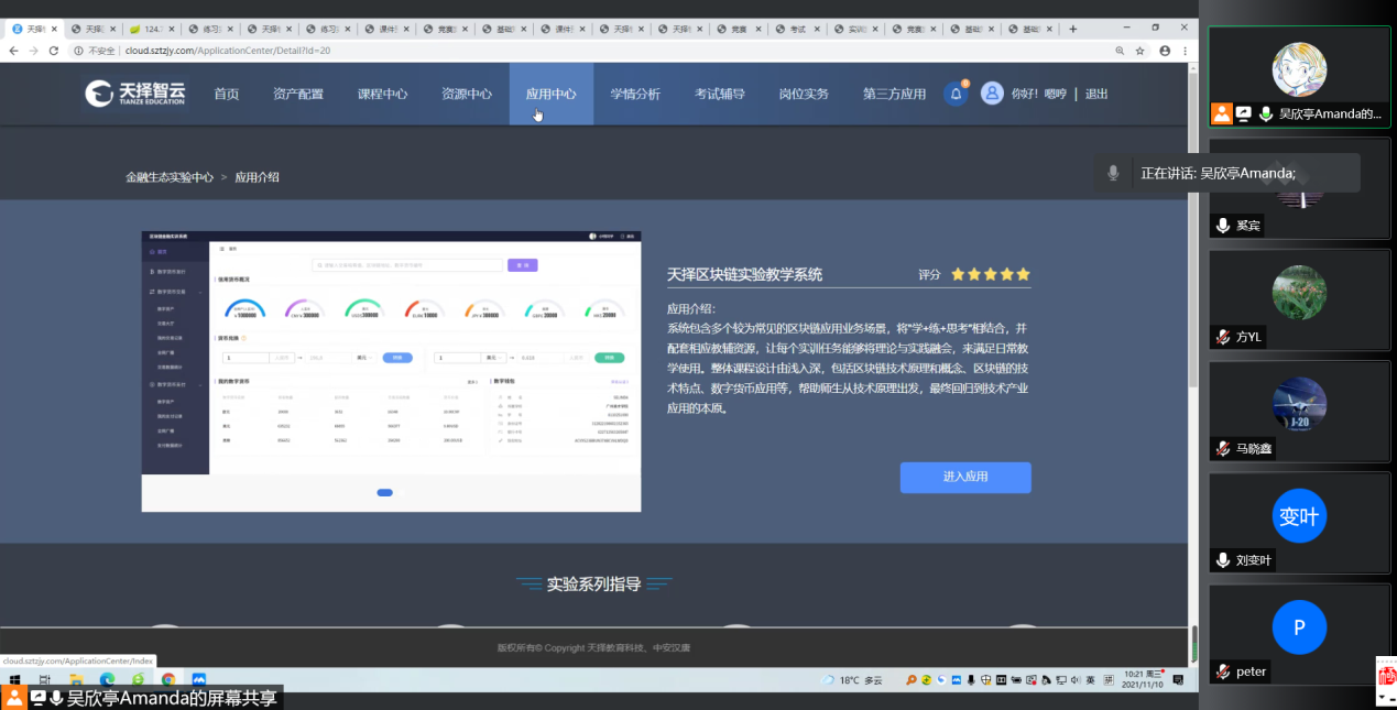 围绕“大数据与金融”“区块链技术及应用”两门课程,课程负责人方永丽老师和刘变叶老师阐述了课程建设构想和思路,天泽科技演示了课程资源,并深入探讨了理论教学和实验衔接问题。两位课程负责人表示一周内做好课程建设方案,克服一切困难扎实推进课程建设工作,确保在开课前完成课程资源建设。