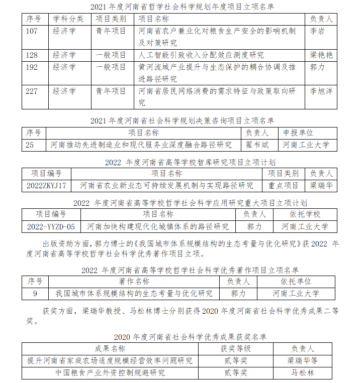 科研项目立项方面,翟书斌教授、郭力博士、李岩博士、梁艳艳博士、李旭洋博士分别获得2021年度河南省哲学社会科学规划决策咨询项目立项、年度项目立项;梁瑞华教授获得2022年度河南省高等星空体育