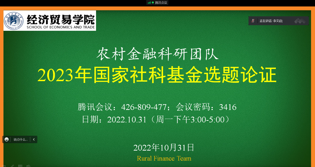 农村金融团队负责人李文启主持此次论证会。孙志娟以“全球供应结构性趋紧下我国海外粮食供应链韧性提升研究”、奚宾以“个人碳账户构建与碳减排路径选择研究”、马晓鑫以“数字金融促进可再生能源技术创新的机制与对策研究”、赵小雨以“新时代‘金融+财政’联动机制支持地方债可持续发展路径研究”、张盼盼以“餐饮业减少餐盘浪费措施研究”为题展开论述。孙院长、邓教授分别就5位老师的选题进行了精彩点评,团队成员宋博、汪桂霞、郭鹏等也对选题进行了交流。