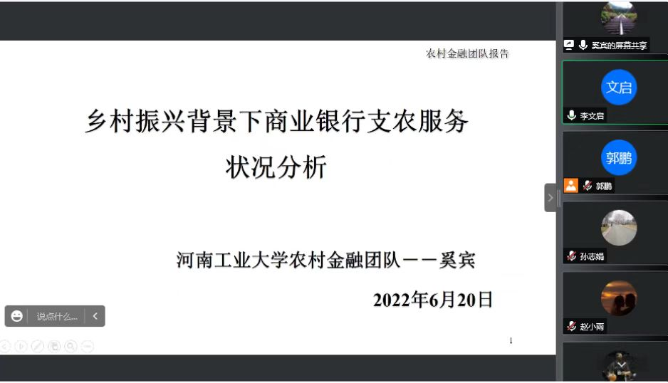 金融系主任奚宾以《乡村振兴背景下商业银行支农服务状况分析》为题做学术报告。奚宾老师主要从县域及服务站储蓄存款贡献度、有效客户增长、渠道建设成效、乡村在线功能、用户数和乡镇支行存款等六方面分析下了中原银行的支农服务现状。针对支农服务存在的问题提出了打造专业服务团队,充实乡村振兴队伍;抢占先机与提质增效并重;深入调研客户需求,深化农民客群经营;贴心专业,打响中原银行农村服务品牌;切实筑牢风控底线等措施。团队成员李文启和宋博对相关问题进行了点评交流。