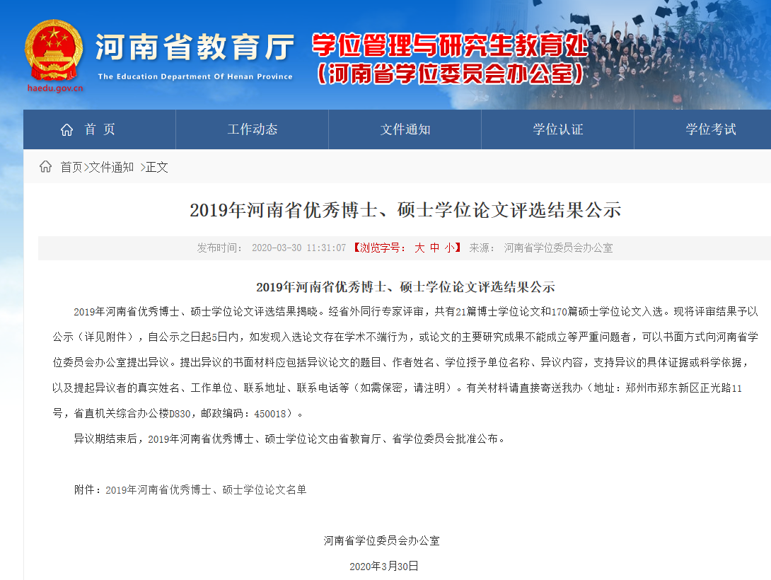 2019年河南省优秀博士、硕士学位论文评选结果公示