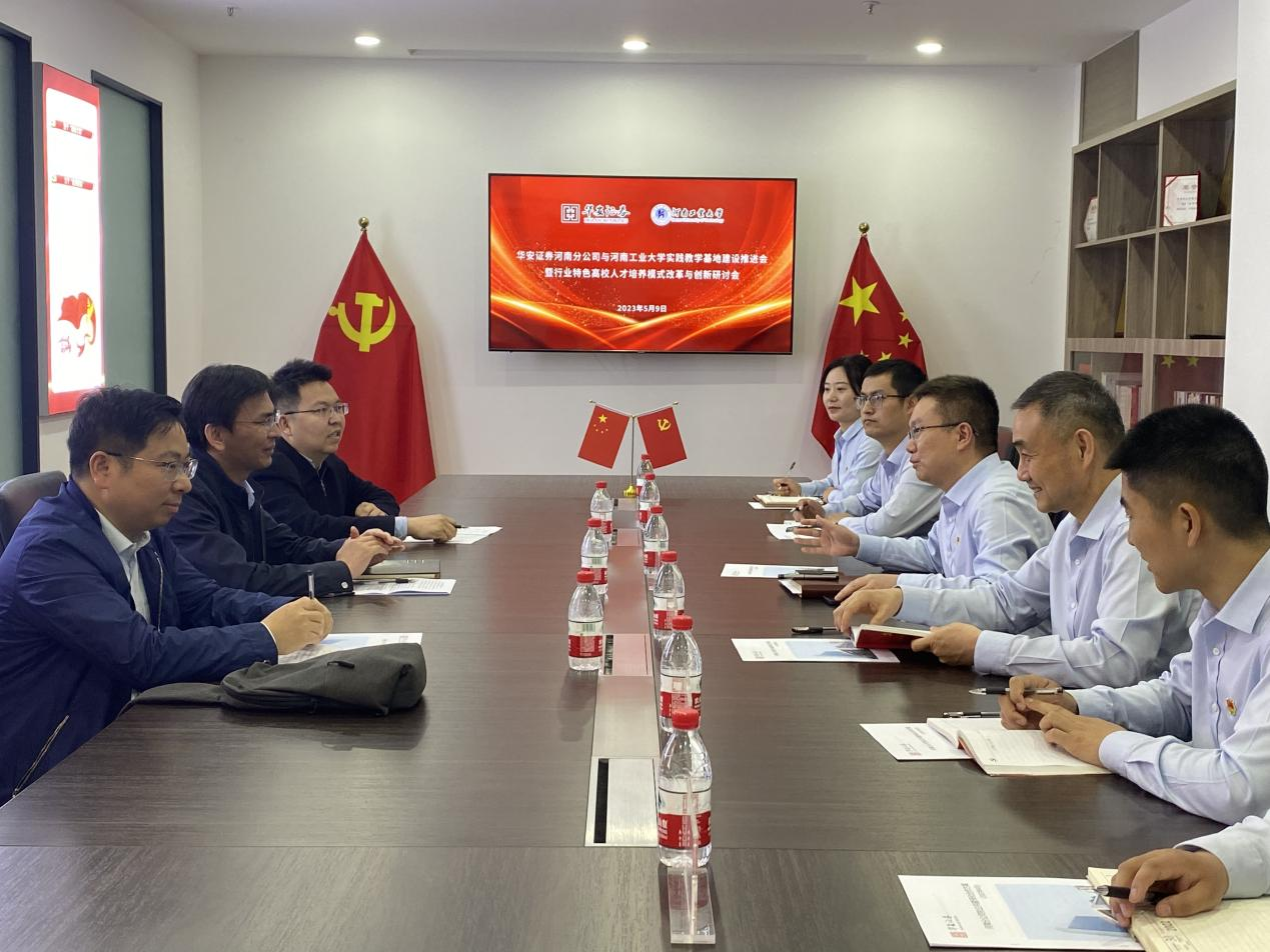 为推进金融学专业建设,落实河南省大学生校外实践教育基地各项任务,进一步开展访企拓岗促就业工作,2023年5月9日,由华安证券和河南工业大学共同指导,华安证券河南分公司、星空体育 联合主办的“星空体育 新文科(金融学)大学生校外实践教育基地建设推进会暨粮食行业特色高校人才培养模式改革与创新研讨会”在华安证券河南省分公司举行,会议由星空体育 实验室主任吴成浩主持。